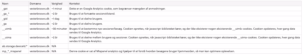 Hvis du vælger at blokere for alle cookies eller sletter eksisterende cookies på din computer, kan du stadig læse tekst på vesterbrosvvs.dk. Dog kan der være funktioner og services du ikke kan bruge, fordi de forudsætter, at webstedet kan huske de valg du foretager.
